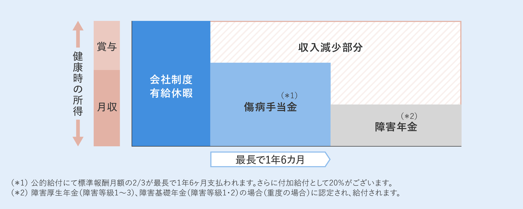 会社や公的給付による『傷病手当金』の受給期間は『最長1年半』であるため、長期的な所得減少に対しては十分ではない点があります。