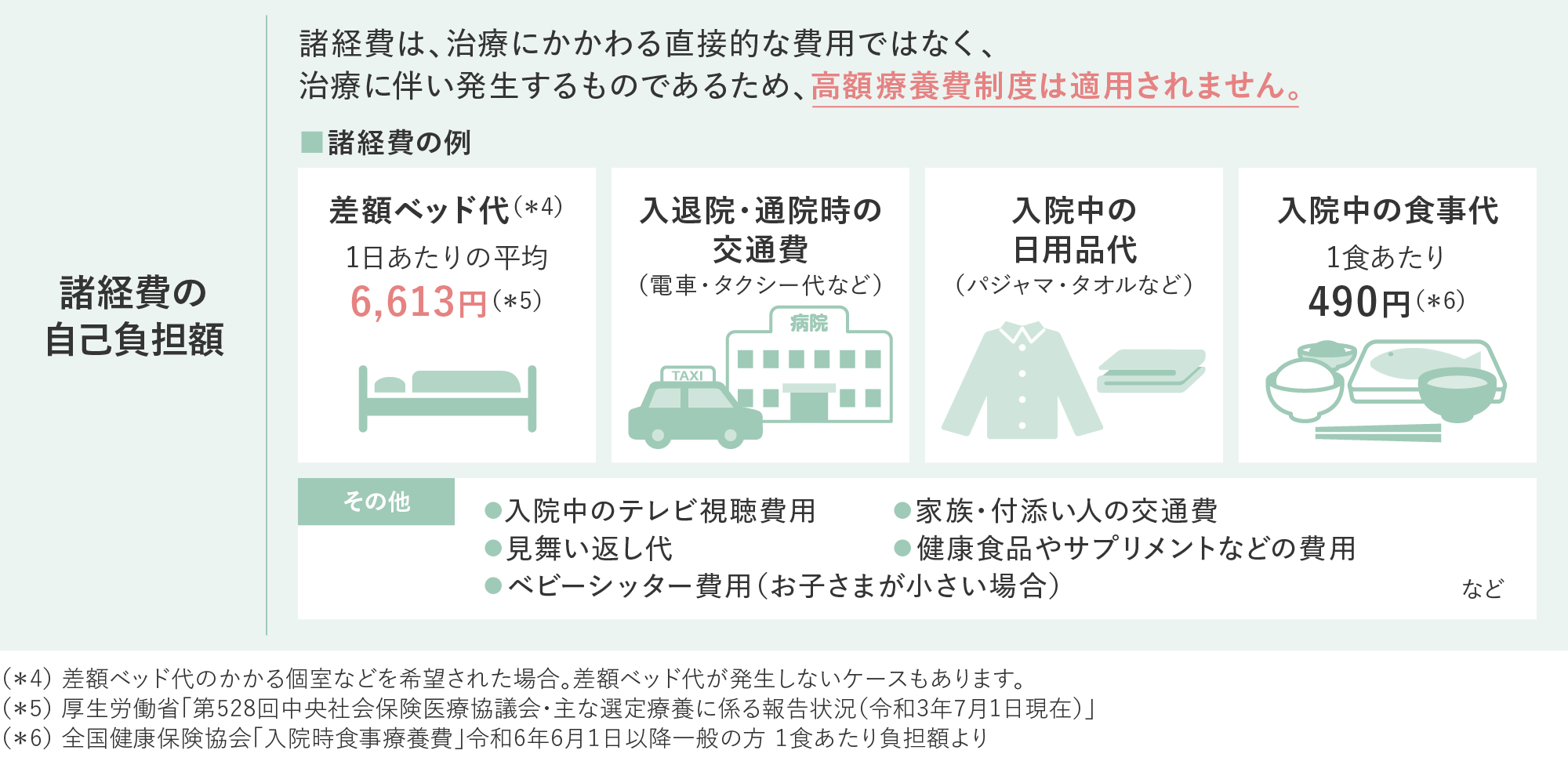入院や通院にかかる諸経費は、公的医療保険ではカバーされないため、事前の準備が必要です。 -